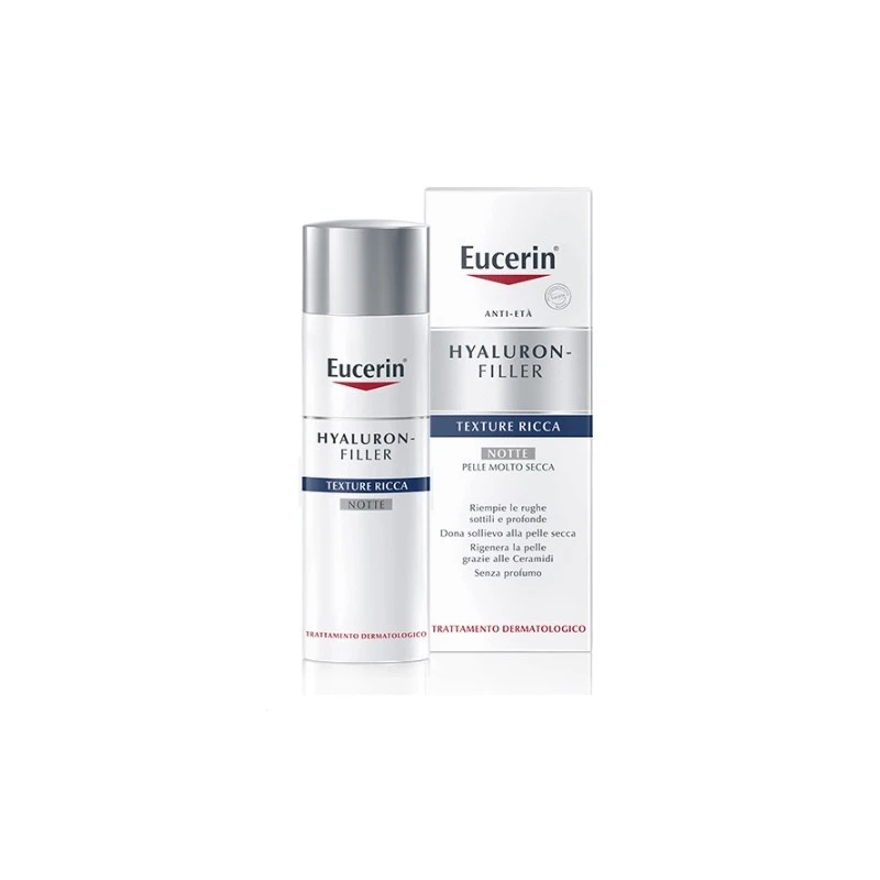 Specificamente formulata per i soggetti con la pelle molto secca e le rughe. L’Urea stimola l’idratazione, l’acido ialuronico riduce la comparsa dei segni di secchezza cutanea e le rughe, e la Ceramide-3 rigenera la pelle durante la notte. Eucerin Hyaluron-Filler Texture Ricca Notte ha un’elevata tollerabilità ed è adatta anche per i soggetti con Psoriasi. La morbida consistenza della crema lascia una piacevole sensazione sulla pelle.
